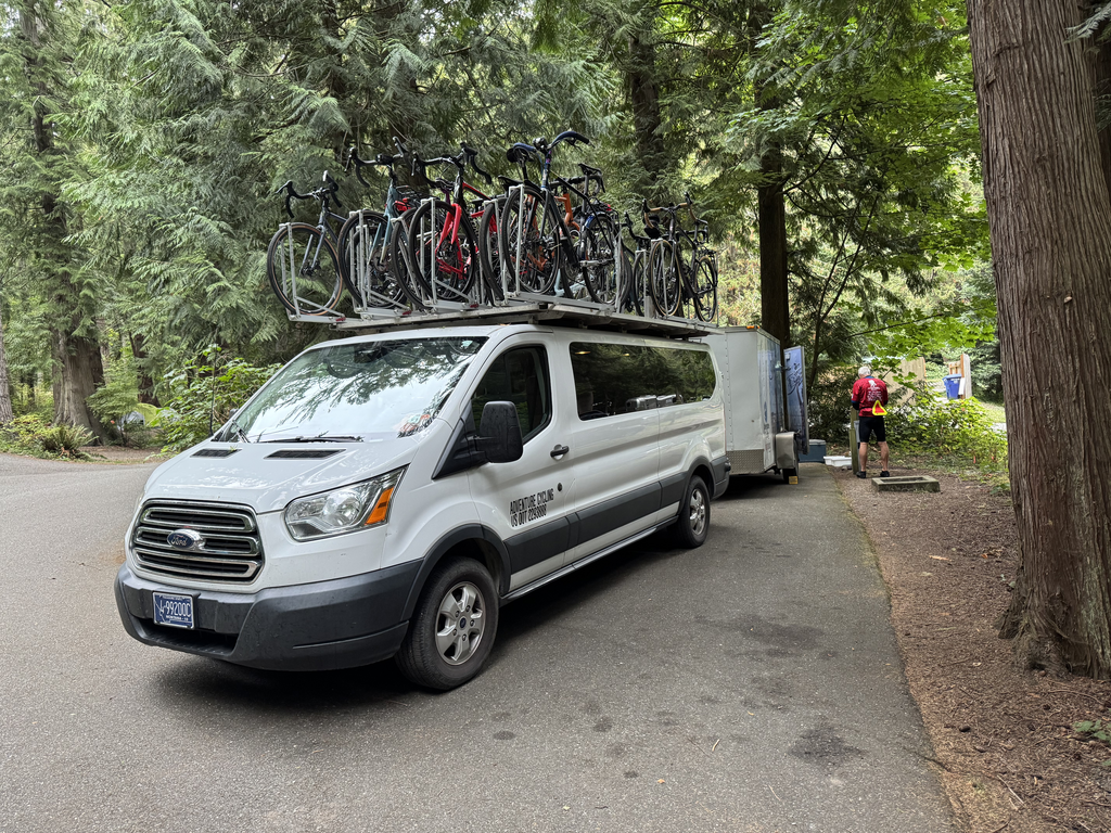 The way these tours work is that we have 12 riders and 2 leaders. The leaders alternate days riding "sweep" (following the last rider to ensure everyone is safe) and driving the van, which is pulling the trailer that has all our kitchen and other sundry supplies.