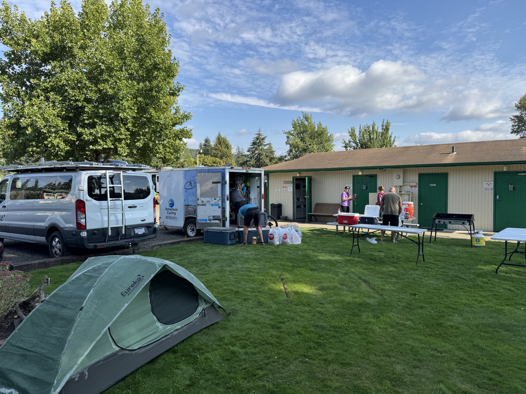 Our overnight is in an RV recently converted from a KOA, so pretty decent overall: nice sites, showers, laundry, power, and a giant chess set! No-one has played yet :-(.
