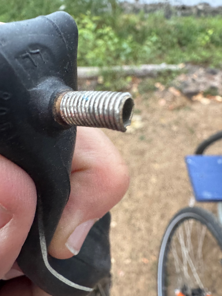 I continued on, hoping to get to another town, and then my rear tire explosively blew out. I had two Kenda tubes (now sold branded as REI), and both of them flatted by the inflation valve breaking in half. This is absolutely crazy. I flipped the bike and put in my spare tube. I'd given up on going to a bike shop, but as long as I had the bike upside down I started messing w/ the rear brake again in full daylight, and was able to get one new pad and one old pad into the calipers. I had a rear brake again! Crazy noisy and not full power, but maybe 70%, good enough!