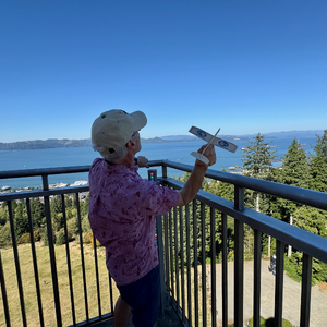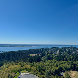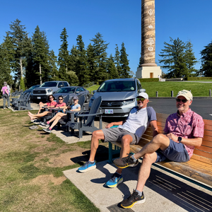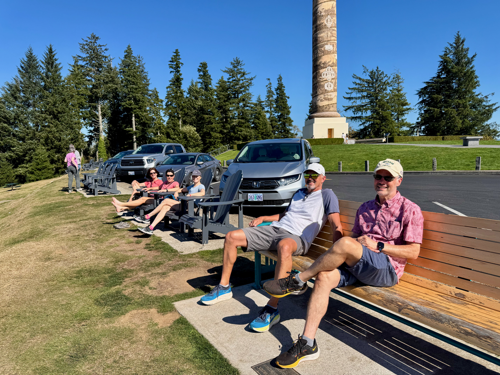 After a breakfast in the parking lot (there was a gazebo), we separated. I walked to the laundromat, and then a bike shop to get some new tubes. Afterwards I caught up on a few work things, did this blob, and then Jim, his wife (Carol?), Anne, Pam, Bob and I piled into Carol's van and went to the Astoria Column, which has 164 steps up and sits on a 600-ft hill. Beautiful views, and the local gimmick is throwing balsa gliders off the top. Most of ours didn't go that far, but Bob's probably went half to three-quarters of a mile and ended up in the sound.