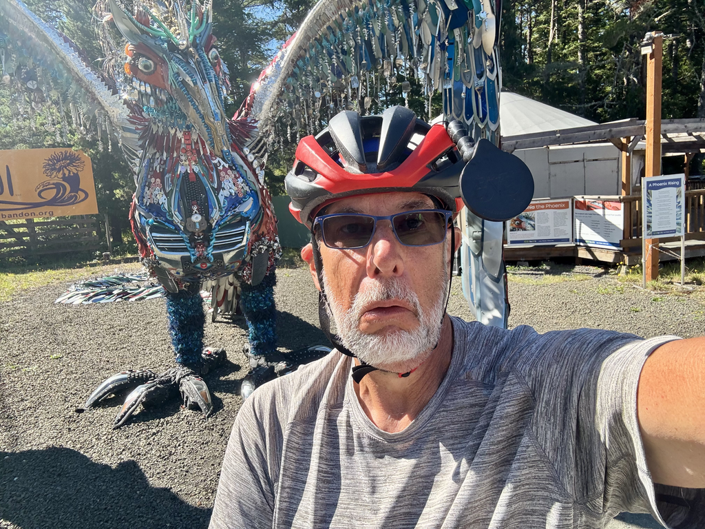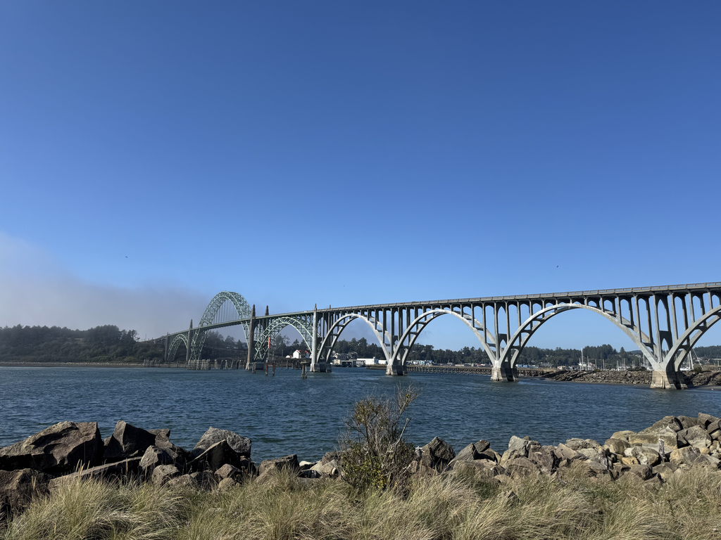 For me one of the highlights was the Yaquina Bay Bridge just before getting to the South Beach State Park campground. This is not a bridge that would cause me problems if on the driving surface. The only option was to walk the half-mile bridge on the narrow sidewalk. So four of us decided to take up a lane. I hit the bicycles-on-bridge button that turned on the flashing yellow lights, Jeff saw a mini-break in the traffic with a truck pulling a boat behind it and immediately pulled out into the lane. The rest of us followed and we cruised peaceably across. We did have one guy wish us a cheerful "Good day!" as we pulled off the road, or at least that's how I choose to interpret it.