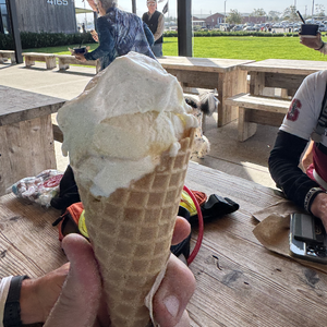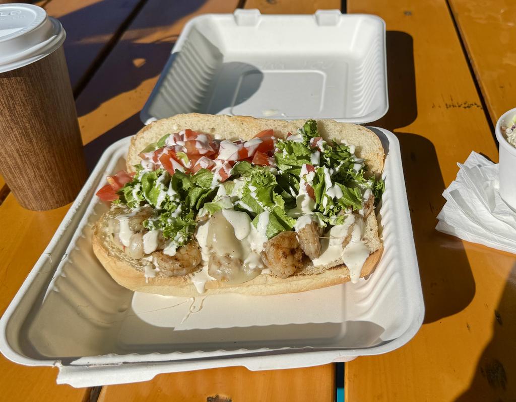 So I started late, but still earlier than our speedsters: Zoey and Bob Hake, who can sprinting around me on an 8% hill. That was impressive. Eventually I made it to the top, and we had miles of fun rollers: hills even enough that if you sprint downhill you have a good chance of creating the next hill still moving along. In this way I caught Jeff G, chatted for a bit, and then caught Doug and Molly. I rode with them for several miles before catching Pam, and we traveled off and on again for the rest of the day. With Stephon we stopped at The Bait and Tackle for espresso (I also had a shrimp po-boy for second breakfast).
