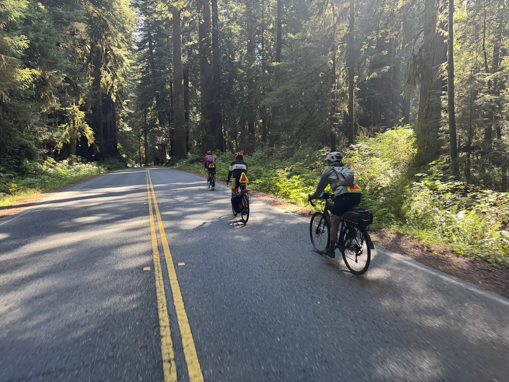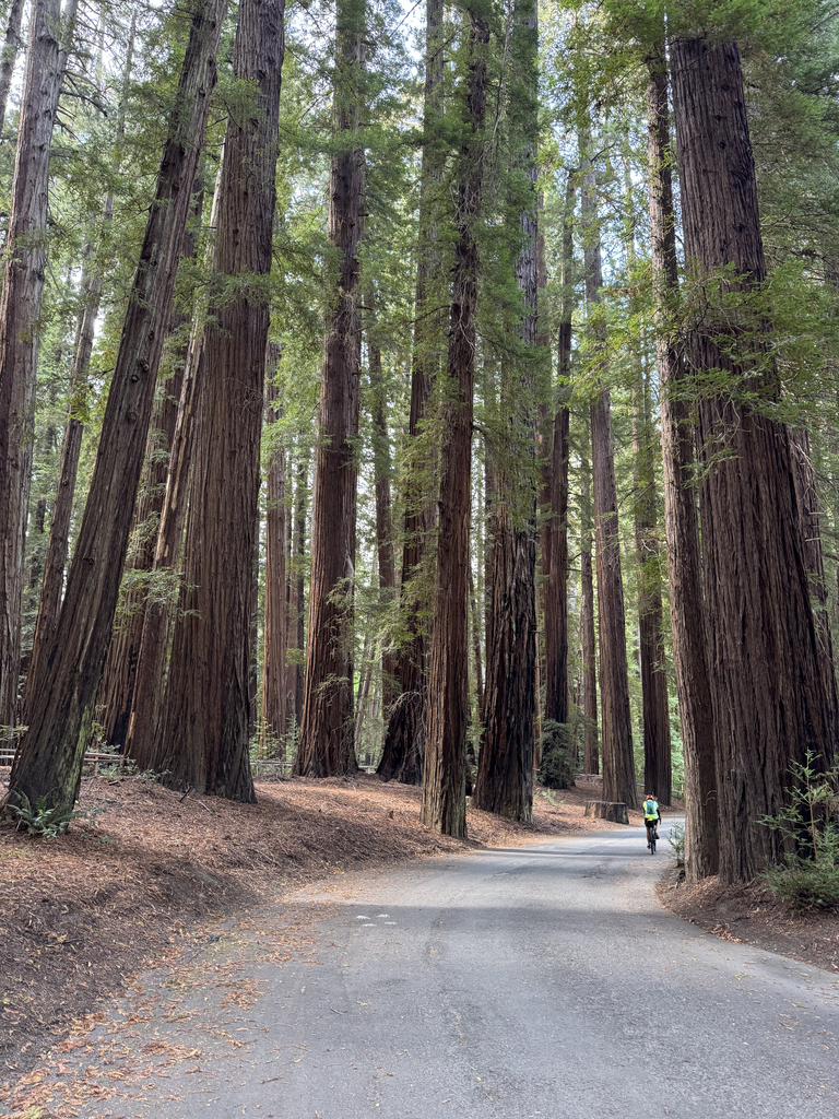 After the climbs, we passed gorgeous beach, and ended up riding the "Redwood Trail", as one sign had it. Basically miles of redwoods completely surrounding us on all sizes. More than one of us compared it to being in a European cathedral, where the environment demands silence, and gives peace
