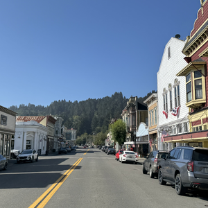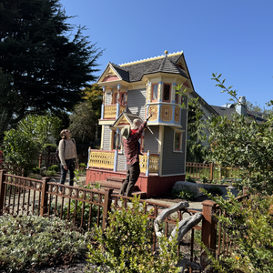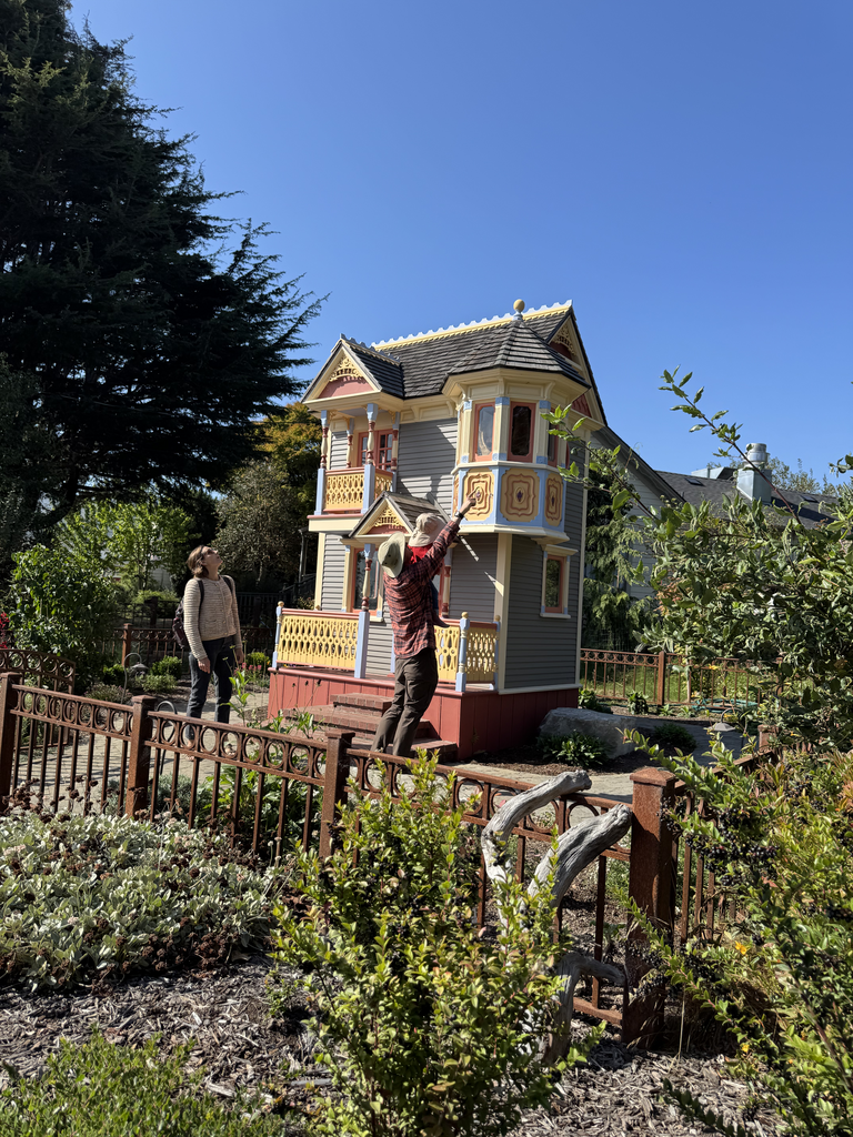 101 here is a four-lane divided highway, fast traffic, but usually decent shoulders. We bumped on and off several times before arriving in Fernwood, which might as well be called Pleasantville. Very cute, well-kept houses, store fronts, and cafes. There was a non-working phone booth. Hadley Gardens was a tiny park w/ cool giant doll houses, shaded walkways, hobbit holes, and a chocolate standard poodle named Fozzie, whose owner is a dead ringer for Catherine O'Hara. Fozzie barked at me until I removed my helmet after which he sat on my foot.