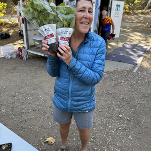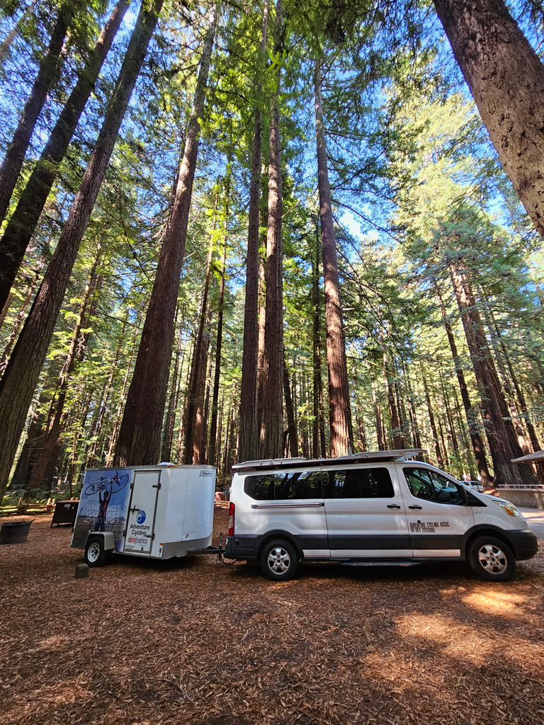 We have a rotating pair of cooks for each day. Ideally, the cooks and the van driver leave the campground at 3pm to go shopping for the dinner, and for breakfast and lunch supplies. In this crowd, the leaders have included themselves in the rota, though this is a bit unusual, and very welcome. W/ a total of 14 people, this means everyone is cook for one day per week, six total in this trip. Hardly honorous, though a bit stressful for those who don't often cook (me). Appetisers (usually chips and veggies) are put out at 5, dinner served at 6, and map meeting (where we discuss the coming day's ride) is at 7. Obviously this sometimes needs to be adjusted for longer or more difficult days (71 miles and 4030 ft of climbing tomorrow), but since we aren't carrying our own gear we can usually get to the site quickly when necessary. And the site is almost always a campground. On the west coast, and especially in NoCal, this usually means beautiful sites, ocean views, maybe a redwood or 100.