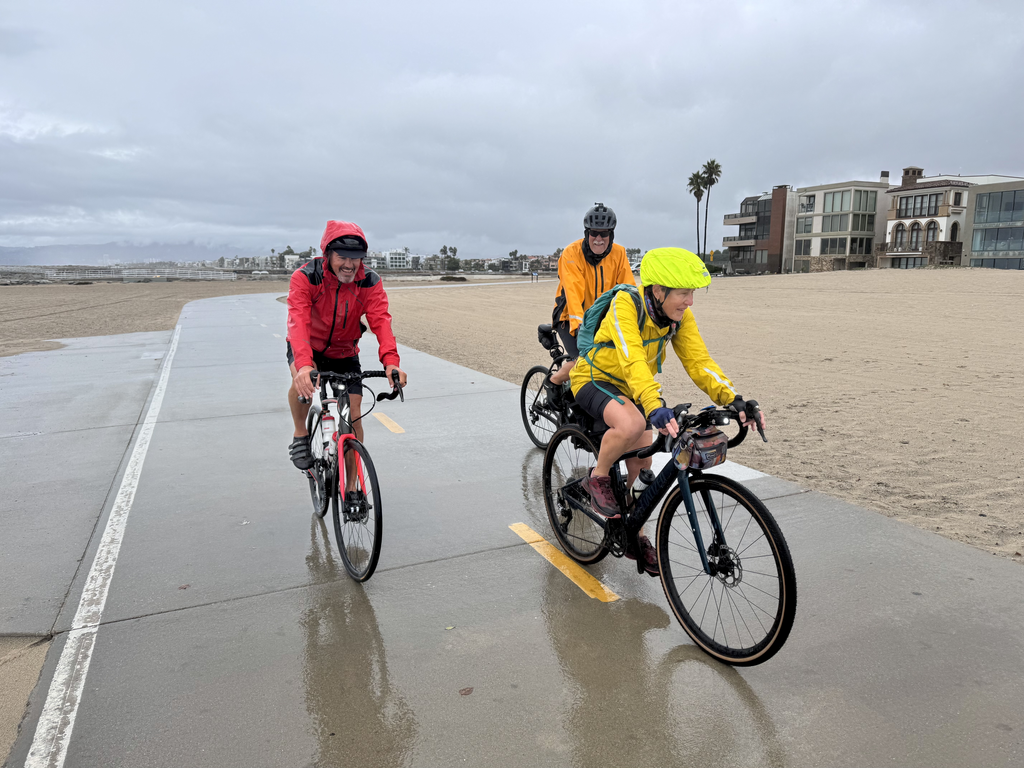 The rain, w/ temp in the 50's, continued for the next 3-4 hours as we rode down a busy road still under construction because of damage from the Palisades fire. There was burned wreckage on the water side; up the hill lots of lots had been razed down to foundations.