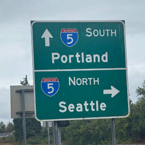 I wasn't worried about the cars, we had a broad shoulder and signage informing drivers about cars. I was more worried about flats: I've ridden three other interstates and gotten flats on two, so I was very careful to not ride close enough to Anne that I couldn't see the kind of truck tire detritus that causes them. I-5 was fun! I got a Starbucks double shot espresso at a rest area and was feeling very strong so I climbed the hills w/ Anne and caught Doug and Molly (who did this tour) on an uphill.